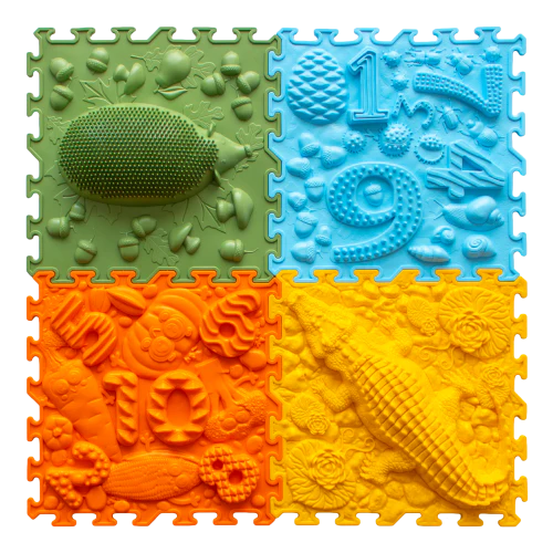 Una amplia gama de texturas y colores de alfombrillas mejoran la imaginación, mejoran la circulación sanguínea, promueven la corrección del pie plano , ayudan a eliminar los edemas en las piernas y apoyan el sistema vestibular.