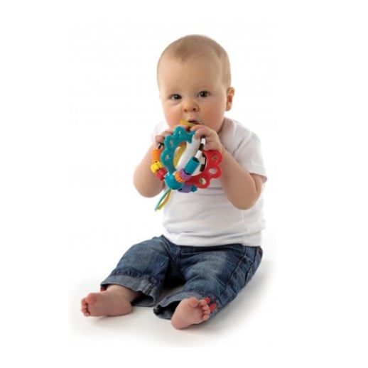 Características: A medida que el bebé sacude y rueda esta bola, las cuentas vibrantes estimulan el sistema auditivo. Las aberturas para los dedos facilitan que el bebé agarre y sostenga. Varias texturas y materiales para la exploración sensorial y la dentición. Cintas de colores para practicar la motricidad fina. Los colores contrastantes promueven la percepción visual. Superficies texturizadas para el desarrollo del tacto. Tamaño perfecto para las pequeñas manos del bebé. Beneficia la motricidad fina, detención, tacto, sonido y visión.