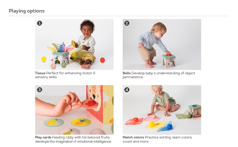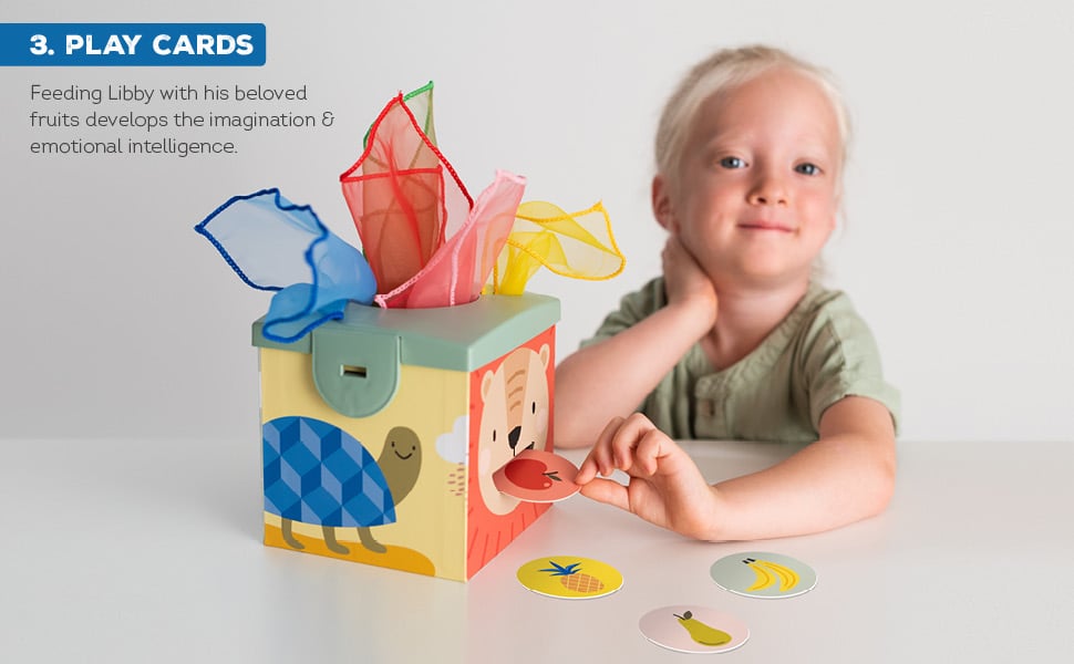 Tarjetas de alimentación: alimentar a Libby con sus queridas frutas desarrolla la imaginación y la inteligencia emocional.