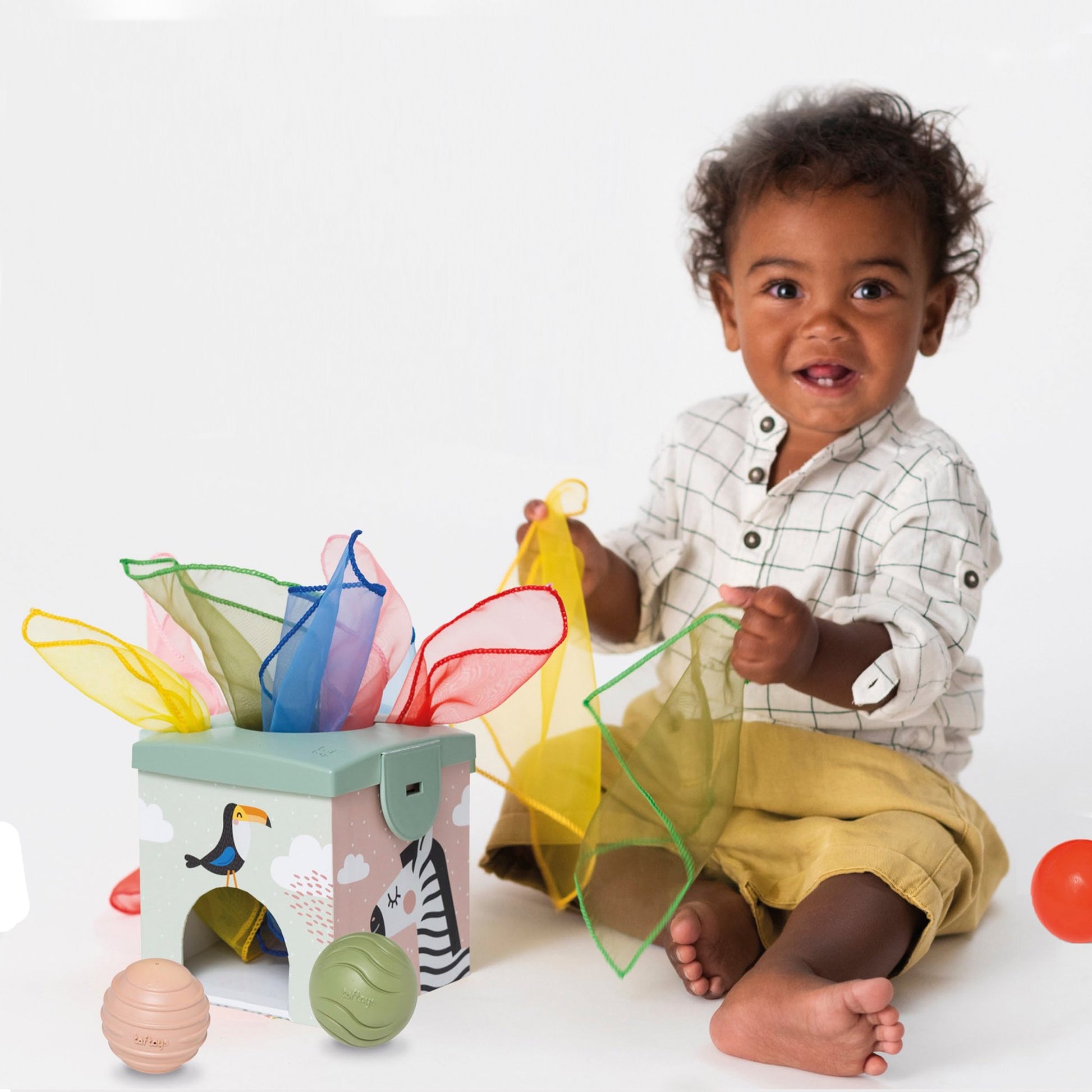 Jugar con nuestra Caja Mágica ayuda al bebé a aprender a vaciar (y luego llenar) los recipientes.
