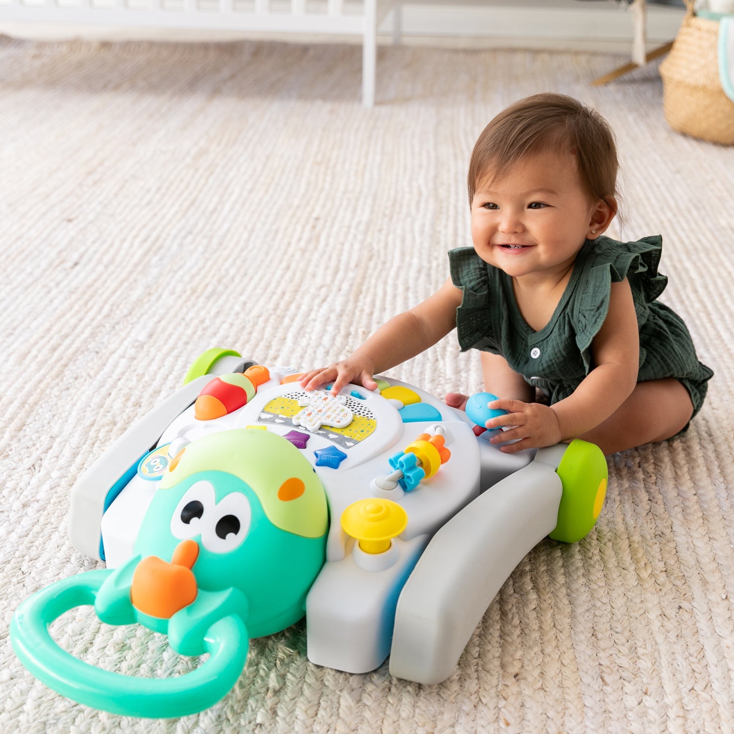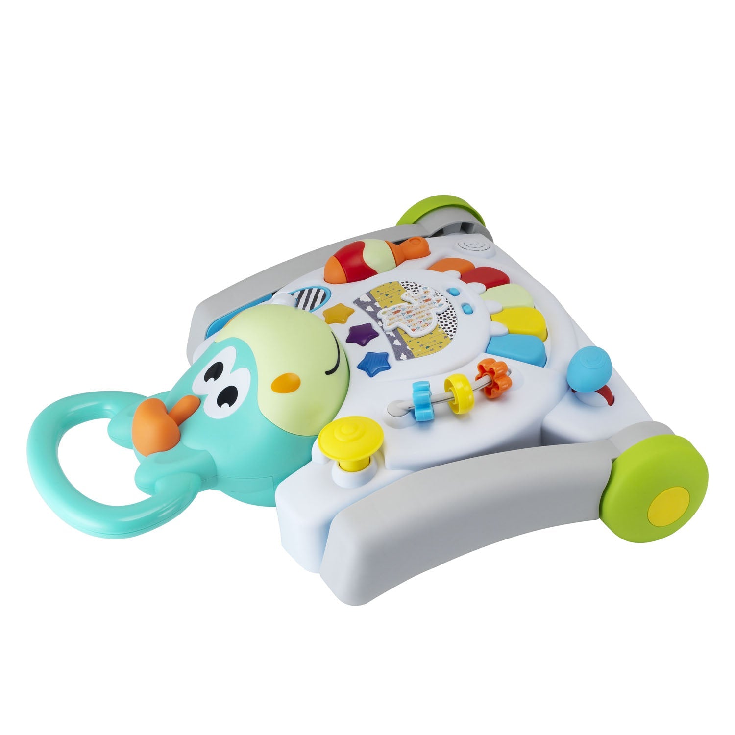 Caminador Centro de Actividades Infantino 3 en 1 Este centro de actividades musicales puede transformarse fácilmente en un andador, una mesa o colocarse en el suelo para jugar boca abajo. Este juguete viene con una multitud de características divertidas como efectos de sonido.También viene con luces LED de colores intermitentes y cinco teclas musicales con efectos de iluminación.