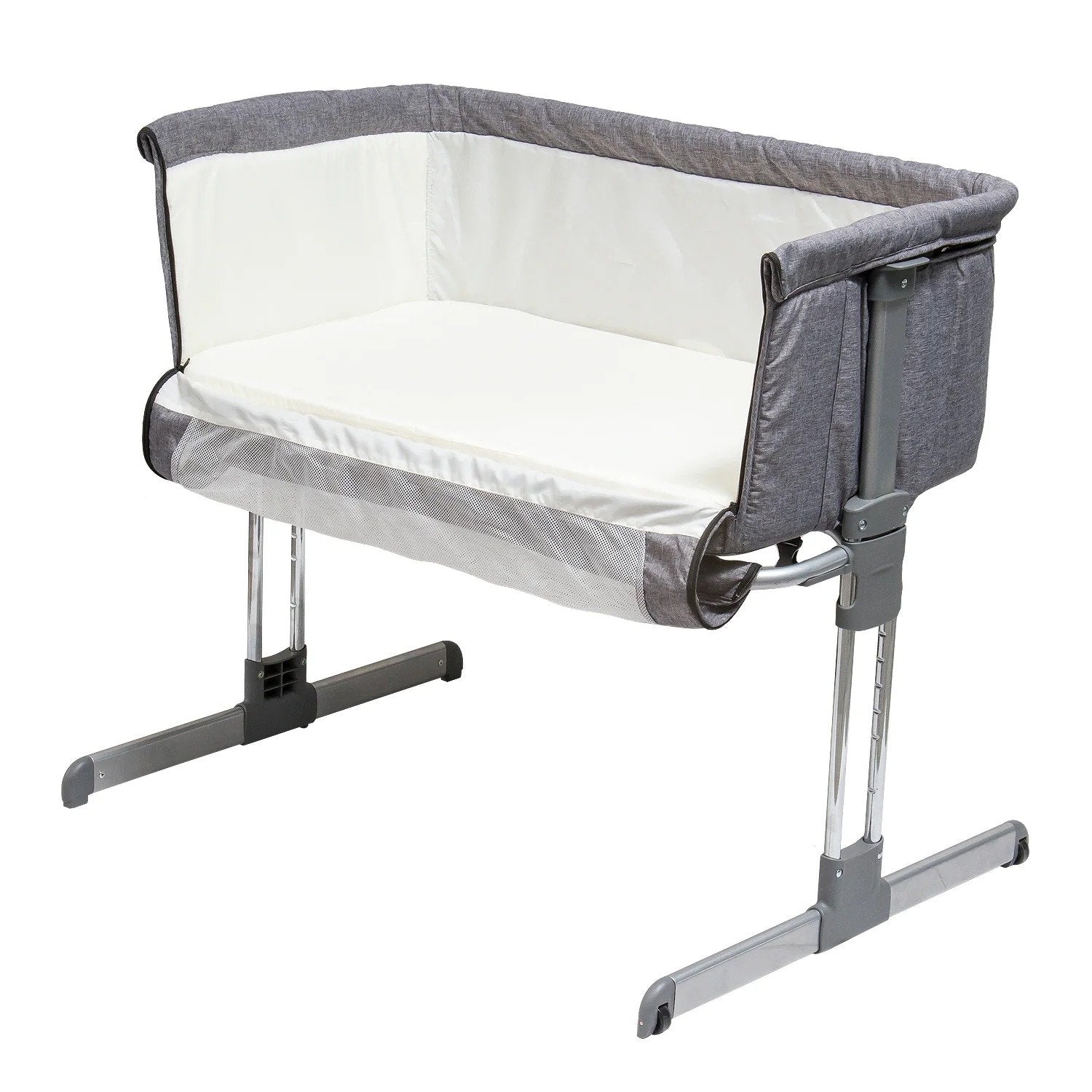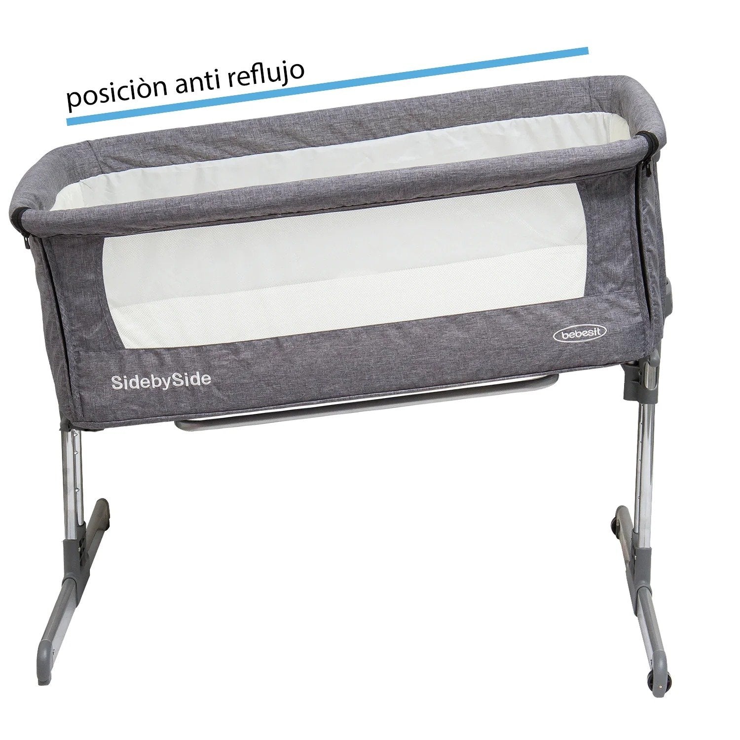 La Cuna Colecho está especialmente diseñada para que puedas dormir cerca a tu pequeño, fabricada en aluminio hace que sea estable y liviana. Cuenta con distintas posiciones de altura para que puedas acomodarla a la cama y un sistema especial de reclinación anti reflujo para el bebé.