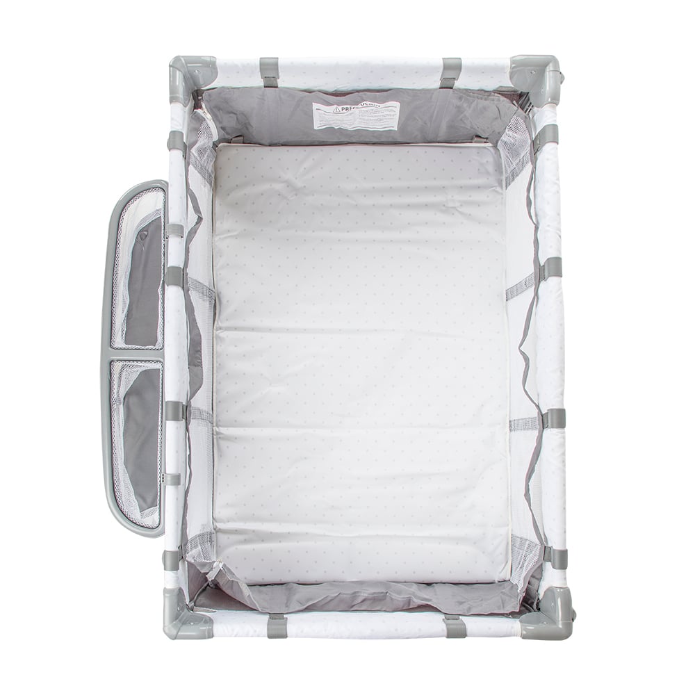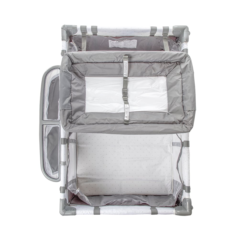 Para tu mayor comodidad, cuenta con dos niveles y puedes incluso convertirla en corral una vez que tu hijo crezca. ¡Es la mezcla perfecta entre una cuna playard y una cuna colecho! Uno de sus rieles laterales, puedes deslizarlo y así la cuna cumplirá la función de colecho, dándote la opción de dormir más cerca de tu bebé cada noche. También cuenta con cinturones de seguridad para mantener la cuna unida a tu cama. ¡Podrás tener todo lo que tu bebé necesita en un solo lugar!