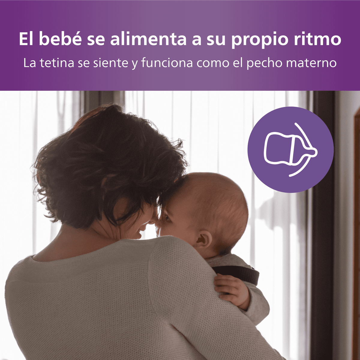 Una tetina que funciona como el pecho. La tetina Natural Response solo libera leche cuando el bebé succiona activamente. Los bebés pueden succionar, tragar y respirar siguiendo su ritmo natural, como en el pecho. Esto facilita la combinación entre la lactancia materna y la mamadera.