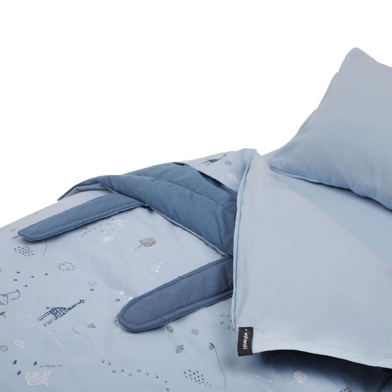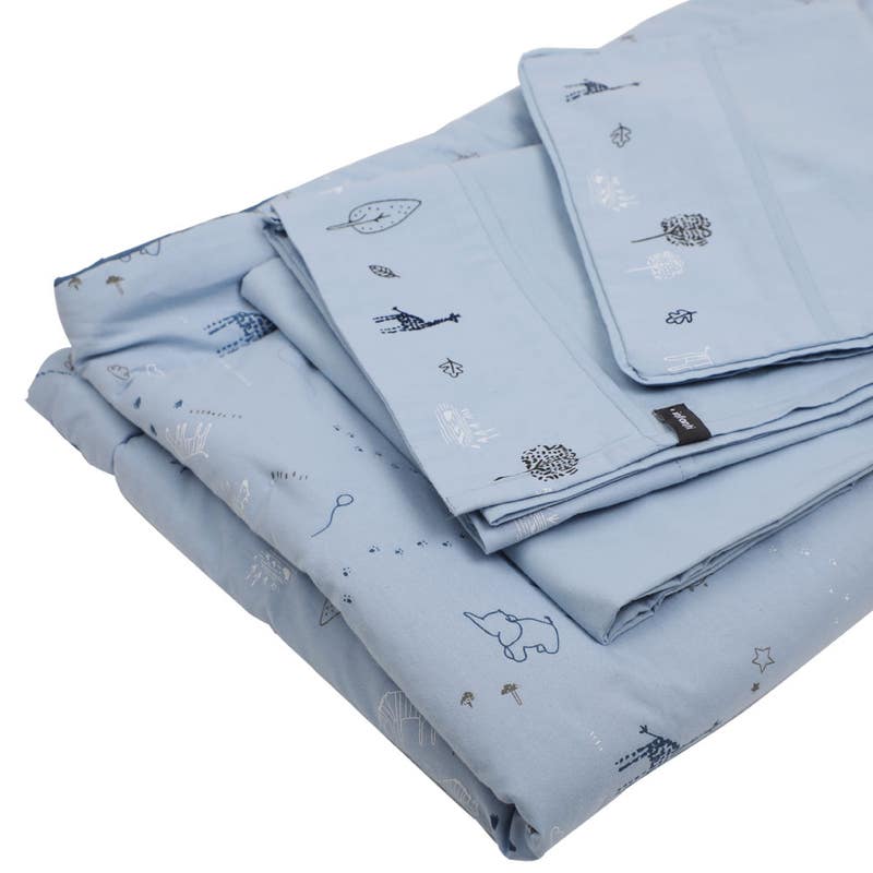 El set incluye un cobertor de 100x122 cm, sábana superior de 105x125 cm, sábana inferior de 100x165 cm y una funda de almohada de 35x55 cm, proporcionando las medidas perfectas para la cuna de tu pequeño desde los primeros meses de vida.