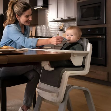El mecanismo de elevación oculto ajusta la altura fácilmente y permite que el bebé se una a la mesa