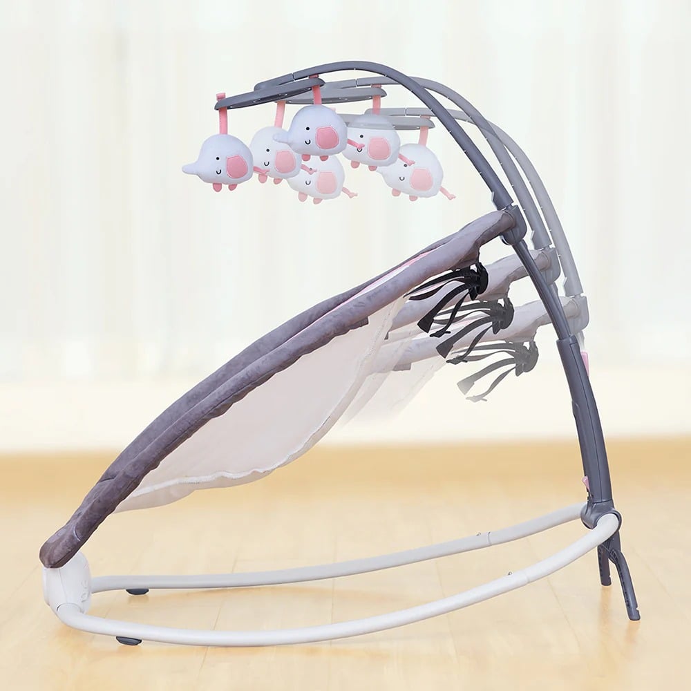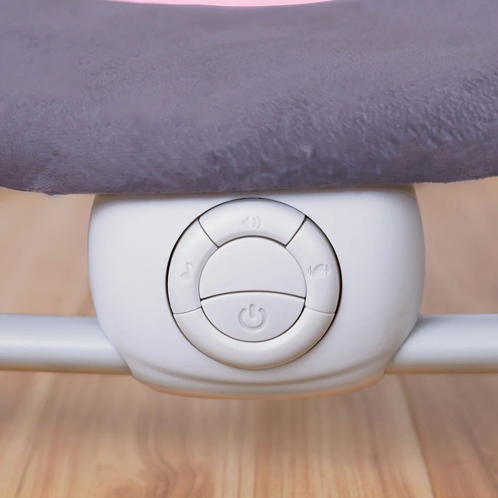 Además, esta silla incluye una barra con 2 adorables juguetes colgantes, junto con 12 melodías relajantes y vibración, ofreciendo momentos de estimulación y relax en todo momento.
