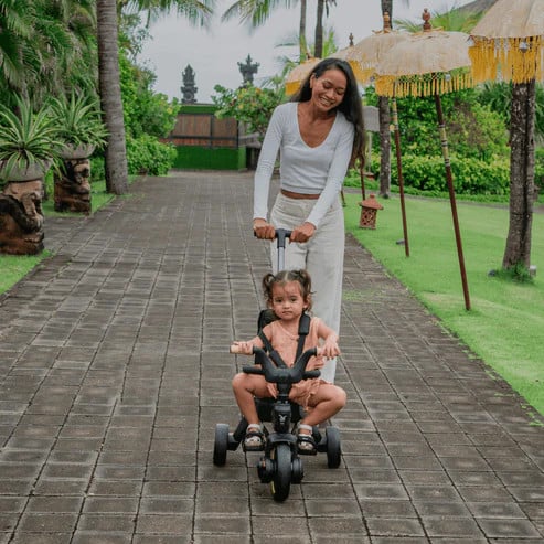 - Dependiendo de la edad del niño y de la situación, la barra de empuje entre la dirección y el pedaleo del niño se puede usar para cambiar de forma rápida y sin esfuerzo.